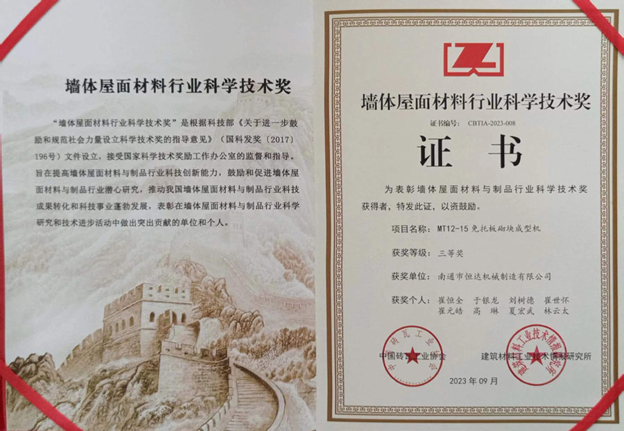 南通市恒達機械制造有限公司獲得墻體屋面材料行業(yè)科學技術三等獎。
